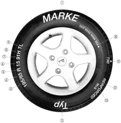 Die technische Ausführung der Bereifung ist durch den § 36 StVZO festgelegt. Danach sind Pkw-Reifen entsprechend der europäischen Vorschrift ECE-R 30 genormt. Dies gilt insbesondere für die Beschriftung der Reifenflanke. Sie gibt über die wichtigsten Daten des Reifens Auskunft. Innerhalb dieser Information sind die für den Autofahrer wichtigen Angaben zusammengestellt - die Norm verlangt darüber hinaus weitere Bezeichnungen auf der Seite wie Herstellername und Reifentyp.